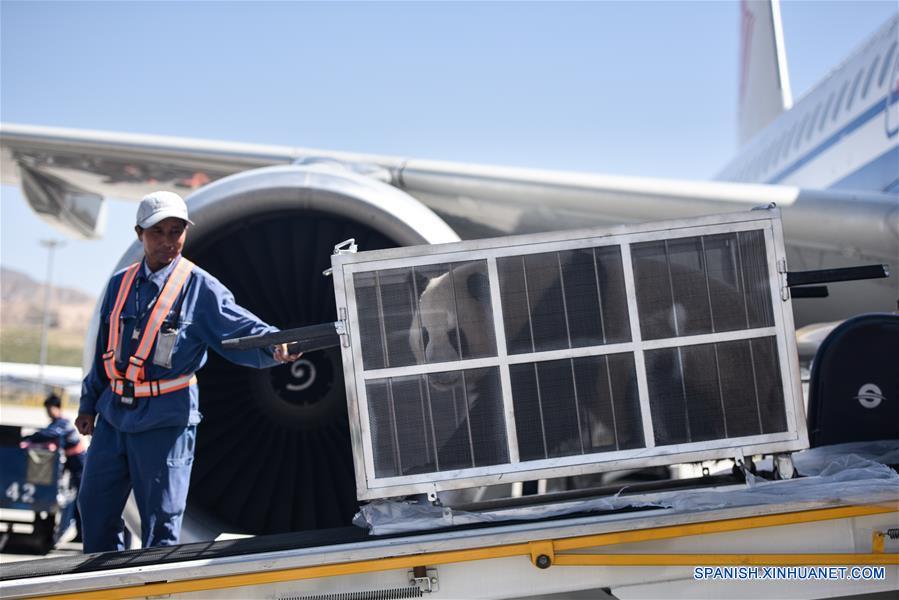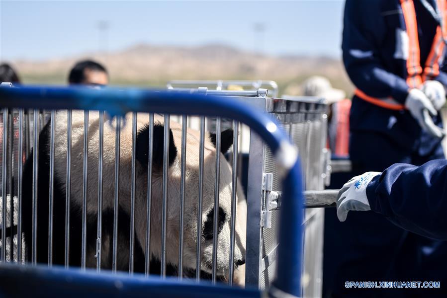 QINGHAI, 3 junio, 2019 (Xinhua) -- Un empleado del aeropuerto transfiere a un panda gigante en el Aeropuerto Internacional de Caojiapu, en Xining, capital de la provincia de Qinghai, en el noroeste de China, el 3 de junio de 2019. Dos pandas llegaron el lunes al Aeropuerto Caojiapu en Xining, capital de la provincia de Qinghai, en el noroeste de China, para convertirse en los primeros pandas en instalarse en la ciudad de la meseta. Los dos pandas, llamados Hexing y Shuangxin, son originarios de la Base de Investigación de Crianza de Pandas Gigantes de Chengdu. (Xinhua/Wu Gang)
