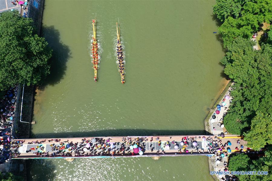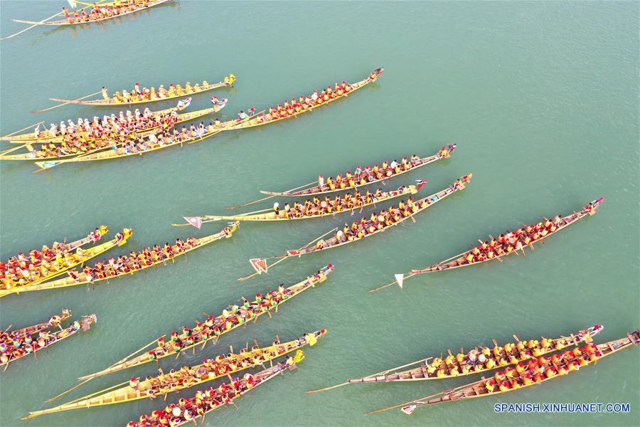 HUNAN, 3 junio, 2019 (Xinhua) -- Vista aérea de personas participando durante una carrera de Botes del Dragón, en el río Xiaoshui, en el distrito Daoxian, en la provincia central de Hunan, en China, el 3 de junio de 2019. Un total de 144 botes participaron en la carrera para celebrar el próximo Festival del Bote del Dragón, que este a?o se conmemora el 7 de junio. (Xinhua/He Hongfu)
