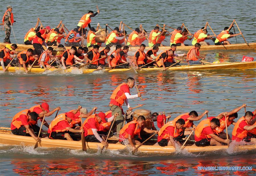 HUNAN, 3 junio, 2019 (Xinhua) -- Personas participan durante una carrera de Botes del Dragón, en el río Xiaoshui, en el distrito Daoxian, en la provincia central de Hunan, en China, el 3 de junio de 2019. Un total de 144 botes participaron en la carrera para celebrar el próximo Festival del Bote del Dragón, que este a?o se conmemora el 7 de junio. (Xinhua/He Hongfu)