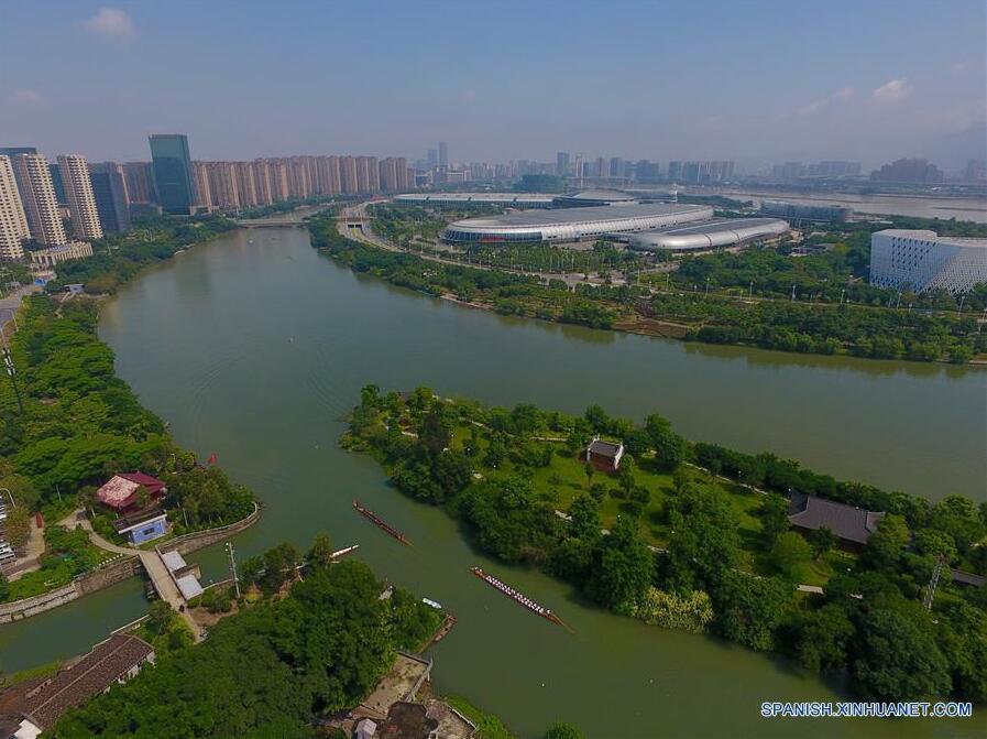FUJIAN, 4 junio, 2019 (Xinhua) -- Vista aérea de personas participando en una carrera de botes de dragón sobre el río Linpu, en el distrito de Cangshan en Fuzhou, capital de la provincia de Fujian, en el sureste de China, el 4 de junio de 2019. Diversas actividades se llevan a cabo en todo el país para celebrar el próximo Festival del Bote del Dragón, o Duanwu, que cae el 7 de junio este a?o. (Xinhua/Jiang Kehong)