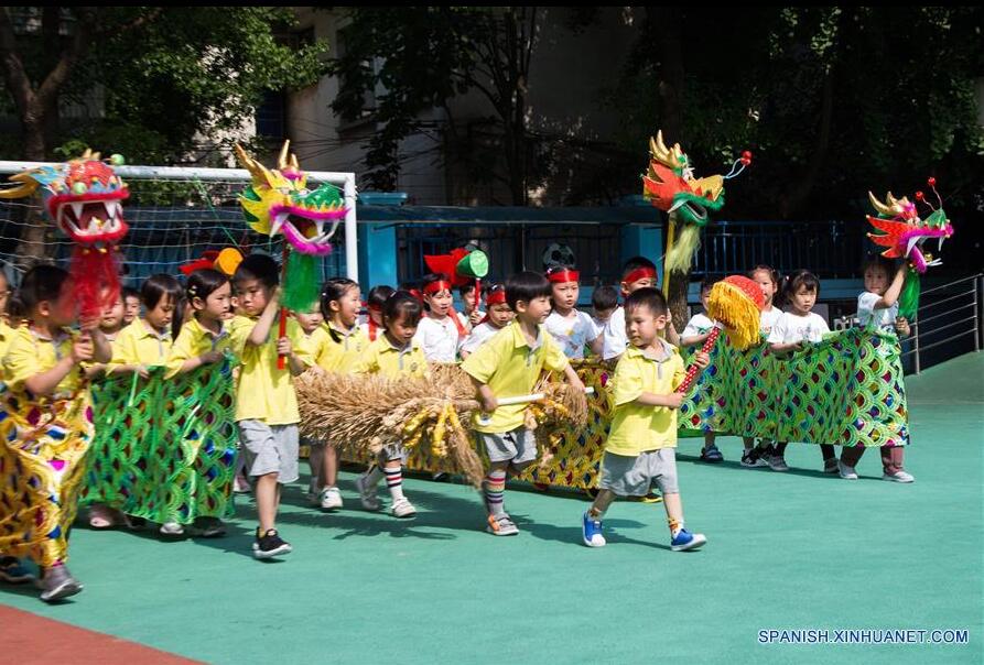 ZHEJIANG, 4 junio, 2019 (Xinhua) -- Ni?os participan en una actividad de carreras de botes de dragón en tierra en un jardín de ni?os, en el distrito de Changxing de la ciudad de Huzhou, provincia de Zhejiang, en el este de China, el 4 de junio de 2019. Diversas actividades se llevan a cabo en todo el país para celebrar el próximo Festival del Bote del Dragón, que cae el 7 de junio este a?o. (Xinhua/Xu Binhua)