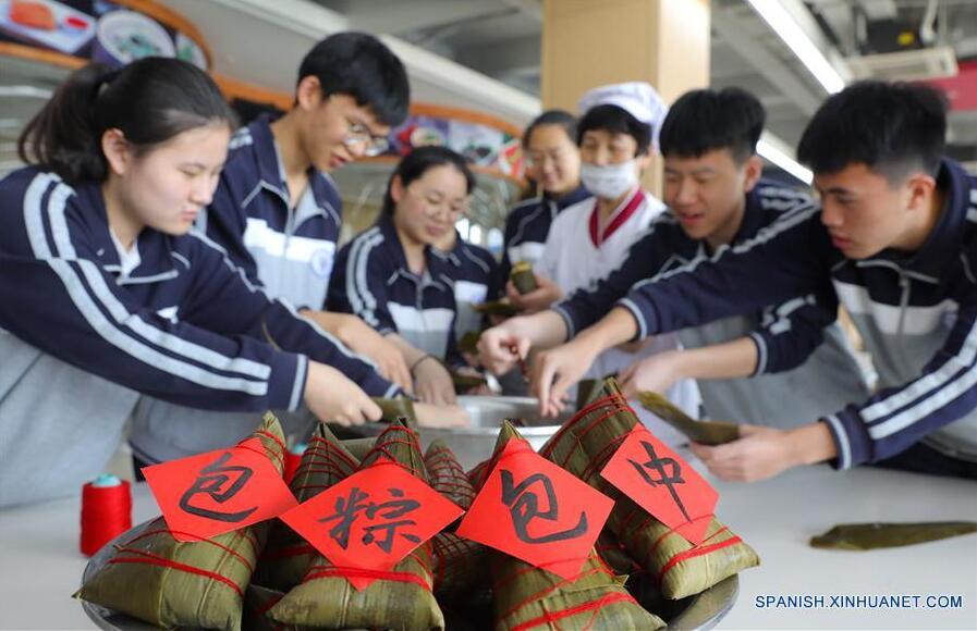 ZHEJIANG, 4 junio, 2019 (Xinhua) -- Candidatos para el examen nacional de ingreso a la universidad elaboran Zongzi, un plato en forma de pirámide elaborado con arroz glutinoso enrollado con hojas de bambú o de ca?a, para pedir por el éxito en el examen, en la ciudad de Zhuji, provincia de Zhejiang, en el este de China, el 4 de junio de 2019. Diversas actividades se llevan a cabo en todo el país para celebrar el próximo Festival del Bote del Dragón, que cae el 7 de junio este a?o. (Xinhua/Luo Shanxin)