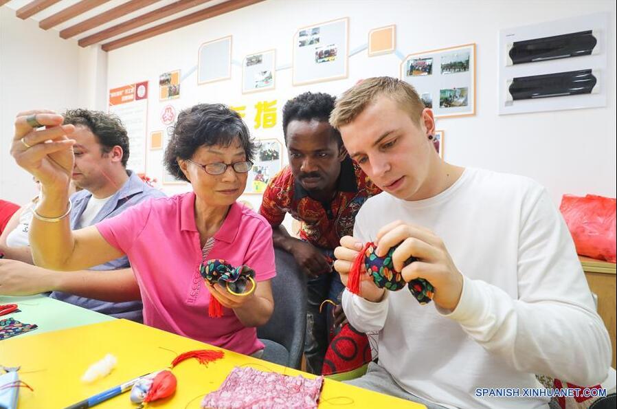 ZHEJIANG, 4 junio, 2019 (Xinhua) -- Extranjeros aprenden a elaborar bolsitas bajo la instrucción de residentes, en el distrito de Deqing de la ciudad de Huzhou, provincia de Zhejiang, en el este de China, el 4 de junio de 2019. Diversas actividades se llevan a cabo en todo el país para celebrar el próximo Festival del Bote del Dragón, que cae el 7 de junio este a?o. (Xinhua/Wang Zheng)