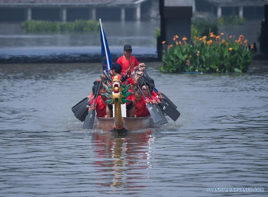 ZHEJIANG, 4 junio, 2019 (Xinhua) -- Vista aérea de personas asistiendo a un entrenamiento para una carrera de botes de dragón, en la localidad de Zhouquan de Tongxiang, provincia de Zhejiang, en el este de China, el 4 de junio de 2019. Varias actividades se llevaran a cabo en todo el país para celebrar el próximo Festival del Bote del Dragón, que cae el 7 de junio este a?o. (Xinhua/Xu Yu)