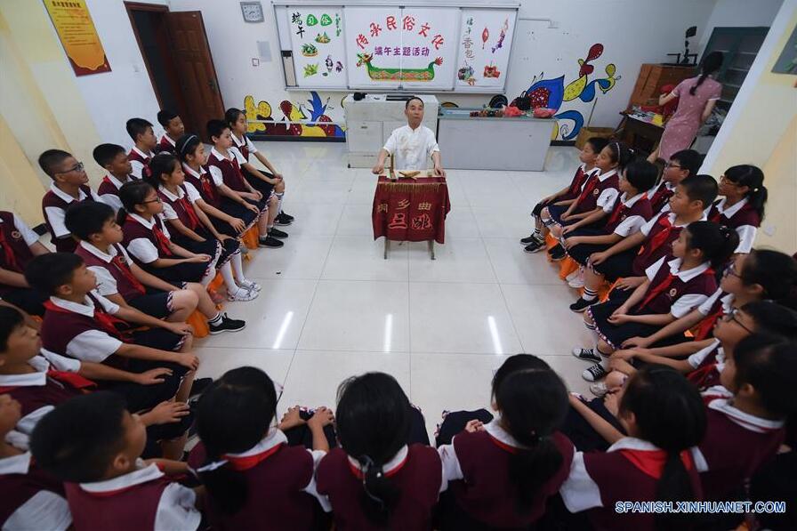 ZHEJIANG, 4 junio, 2019 (Xinhua) -- Un artista popular realiza una presentación para los estudiantes durante un curso sobre costumbres populares en la Escuela Primaria Experimental de Zhouquan, en la localidad de Zhouquan de Tongxiang, provincia de Zhejiang, en el este de China, el 4 de junio de 2019. Varias actividades se llevaran a cabo en todo el país para celebrar el próximo Festival del Bote del Dragón, que cae el 7 de junio este a?o. (Xinhua/Xu Yu)
