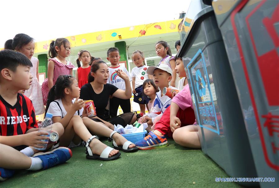 JIANGSU, 5 junio, 2019 (Xinhua) -- Una profesora explica el conocimiento de clasificación de basura a los ni?os en un jardín de infantes, en el distrito de Donghai, provincia de Jiangsu, en el este de China, el 5 de junio de 2019. Diversas actividades se llevan a cabo en todo el país para elevar la conciencia de las personas sobre la clasificación de la basura y ayudarles a desarrollar el hábito de la clasificación de residuos. (Xinhua/Zhang Kaihu)