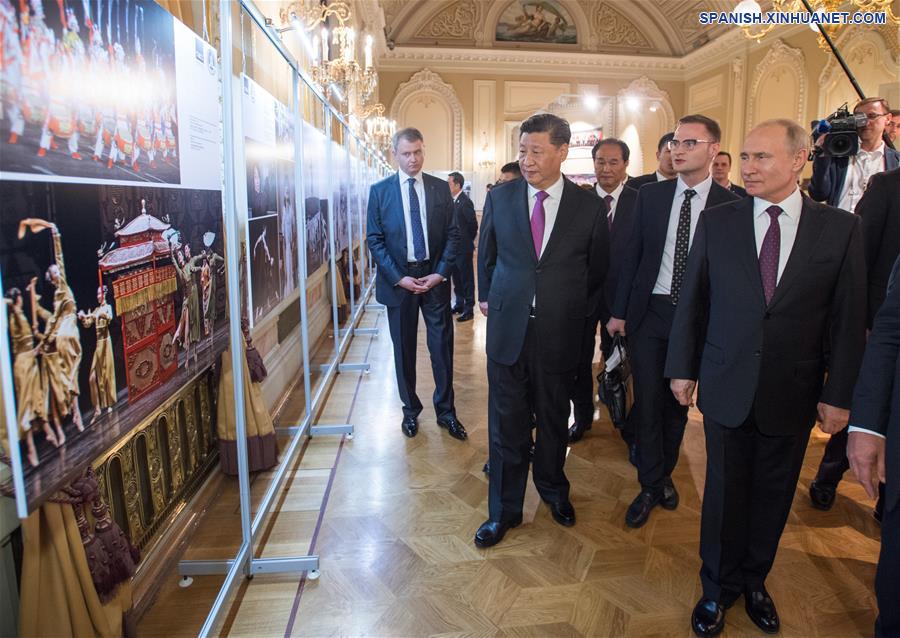 El presidente chino, Xi Jinping, y su homólogo ruso Vladimir Putin, visitan una exposición fotográfica antes de asistir a una reunión con motivo del 70 aniversario del establecimiento de las relaciones diplomáticas China-Rusia en Moscú, Rusia, el 5 de junio de 2019. (Xinhua/Li Xueren)