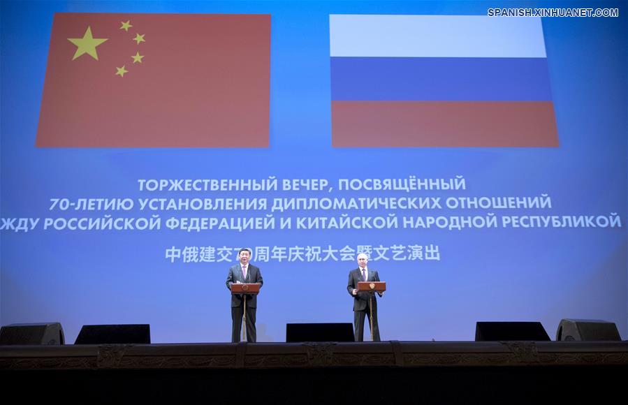 MOSCú, 6 jun (Xinhua) -- El presidente de China, Xi Jinping, y su homólogo ruso, Vladimir Putin, asistieron el miércoles a un encuentro para conmemorar el 70o aniversario del establecimiento de las relaciones diplomáticas entre los dos países.