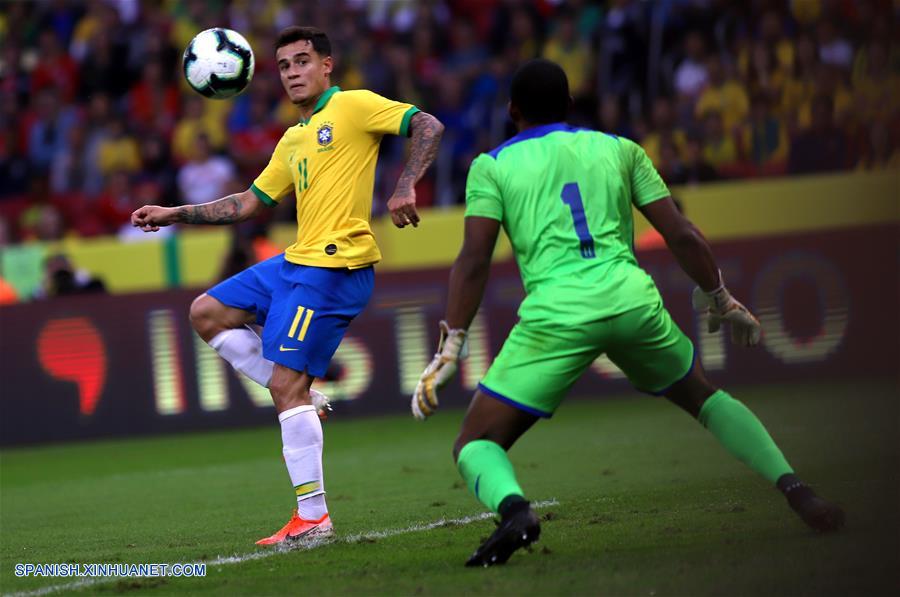 El jugador Philippe Coutinho (i), de Brasil, disputa el balón con el guardameta Luiz López (d), de Honduras, durante el partido amistoso en preparación para la Copa América Brasil 2019, en Porto Alegre, Brasil, el 9 de junio de 2019. (Xinhua/Rahel Patrasso)