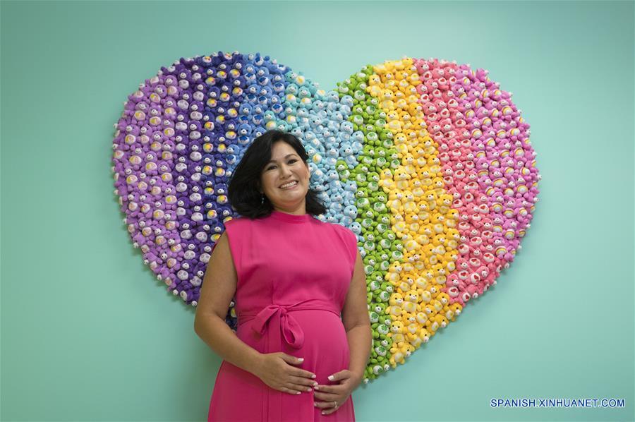 TEXAS, 11 junio, 2019 (Xinhua) -- Imagen del 10 de junio de 2019 de una mujer embarazada tomándose fotografías frente a una pared de Care Bear con forma de corazón en la fábrica FOMO, en Houston, estado de Texas, Estados Unidos. La fábrica FOMO invitó a las personas a revivir o reimaginar su infancia con sus cinco sentidos con 17 salas llenas con diferentes elementos inmersivos en la exposición. (Xinhua/Yi-Chin Lee)