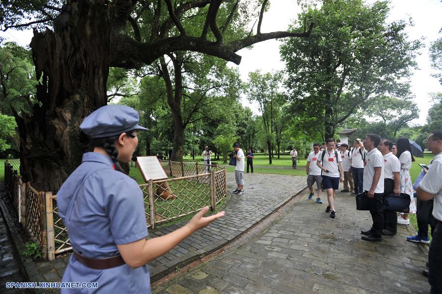 Periodistas participan en una entrevista colectiva durante una actividad para seguir las huellas de la Gran Marcha, en un sitio revolucionario en la ciudad de Ruijin, en la provincia de Jiangxi, en el este de China, el 11 de junio de 2019. La actividad tiene como objetivo rendir homenaje a los mártires revolucionarios y transmitir las tradiciones de la revolución, en un a?o en que el país celebra el 70 aniversario de la fundación de la República Popular China. Más de 500 periodistas de más de 30 medios de comunicación de todo el país asistieron a las ceremonias. La Gran Marcha fue una maniobra militar llevada a cabo por el Ejército Rojo de Obreros y Campesinos de China entre 1934 y 1936. Durante este período, los soldados dejaron atrás sus bases y marcharon a través de ríos, monta?as y praderas para romper el asedio de las fuerzas del Kuomintang y continuar con su lucha contra los agresores japoneses. Muchos caminaron hasta 12.500 kilómetros. (Xinhua/Li Renzi)