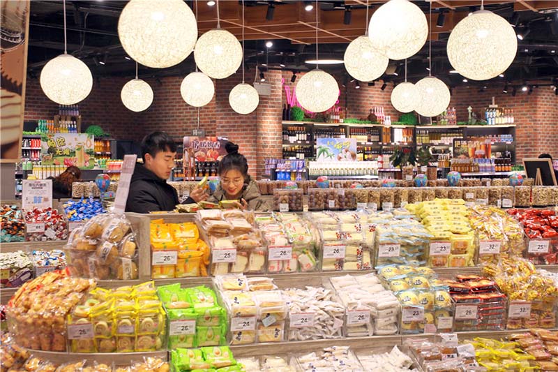 Los clientes escogen diferentes aperitivos de un supermercado en Yantai, provincia de Shandong. [Foto de Tang Ke / For China Daily]