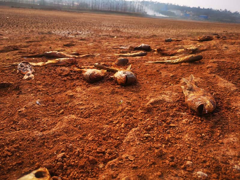 El embalse de Heinigou, que puede contener hasta 600.000 metros cúbicos de agua, se ha secado por completo. Xiaobaih, Luliang, Yunnan. [Foto: Li Jianfei/ Chinadaily.com.cn]