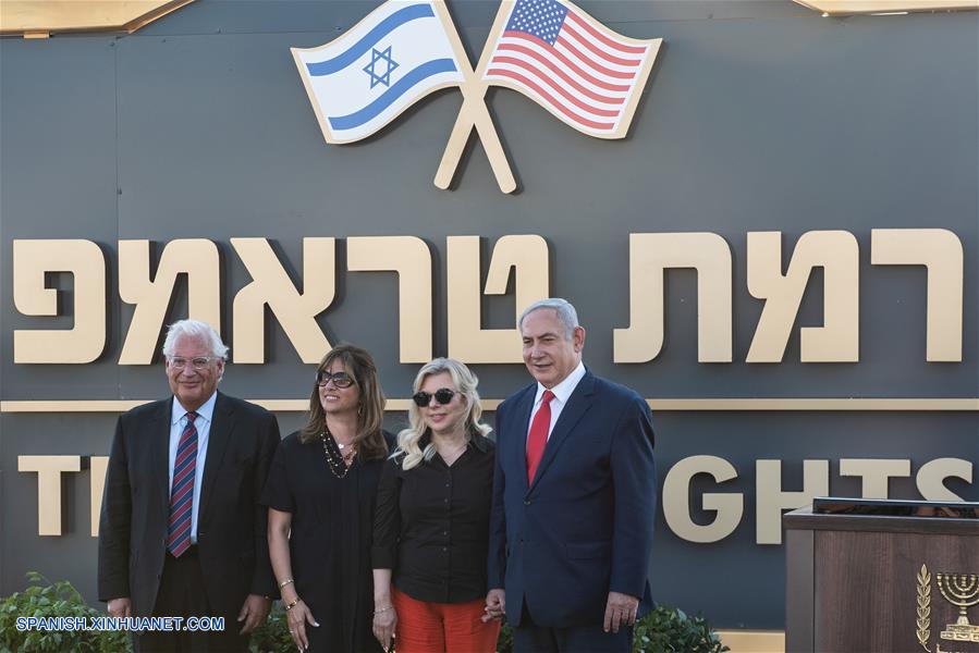 ALTOS DEL GOLAN, 16 junio, 2019 (Xinhua) -- El primer ministro israelí, Benjamin Netanyahu (d), y el embajador estadounidense en Israel, David Friedman (i), asisten a la ceremonia de presentación de "Altos Trump", en Altos del Golán, el 16 de junio de 2019. El gobierno de Israel inauguró el domingo un nuevo asentamiento en los anexados Altos del Golán, al que puso el nombre del aliado cercano del país, el presidente estadounidense Donald Trump. (Xinhua/JINI/Ayal Margolin)