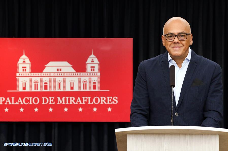 CARACAS, 17 junio, 2019 (Xinhua) -- Imagen cedida por la Presidencia de Venezuela del ministro venezolano de Comunicación e Información, Jorge Rodríguez, durante una conferencia de prensa, en el Palacio de Miraflores, en Caracas, Venezuela, el 17 de junio de 2019. Rodríguez divulgó el lunes nuevas pruebas que demostrarían actos de corrupción del diputado opositor Juan Guaidó y su entorno. (Xinhua/Presidencia de Venezuela)
