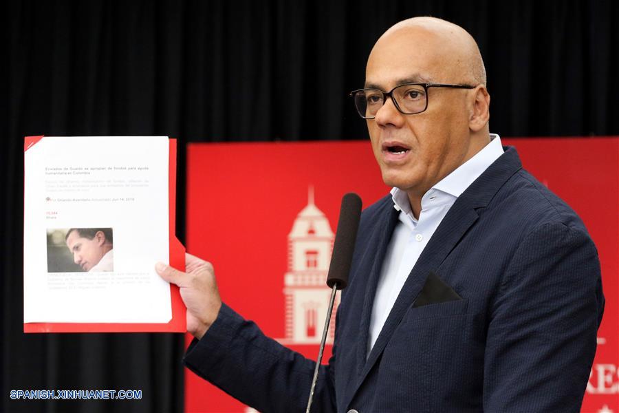 CARACAS, 17 junio, 2019 (Xinhua) -- Imagen cedida por la Presidencia de Venezuela del ministro venezolano de Comunicación e Información, Jorge Rodríguez, hablando durante una conferencia de prensa, en el Palacio de Miraflores, en Caracas, Venezuela, el 17 de junio de 2019. Rodríguez divulgó el lunes nuevas pruebas que demostrarían actos de corrupción del diputado opositor Juan Guaidó y su entorno. (Xinhua/Presidencia de Venezuela)