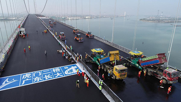 Trabajadores terminan de pavimentar la carretera del segundo puente Humen, desembocadura del Río Perla, a finales de enero del 2019. [Foto: China News Service]