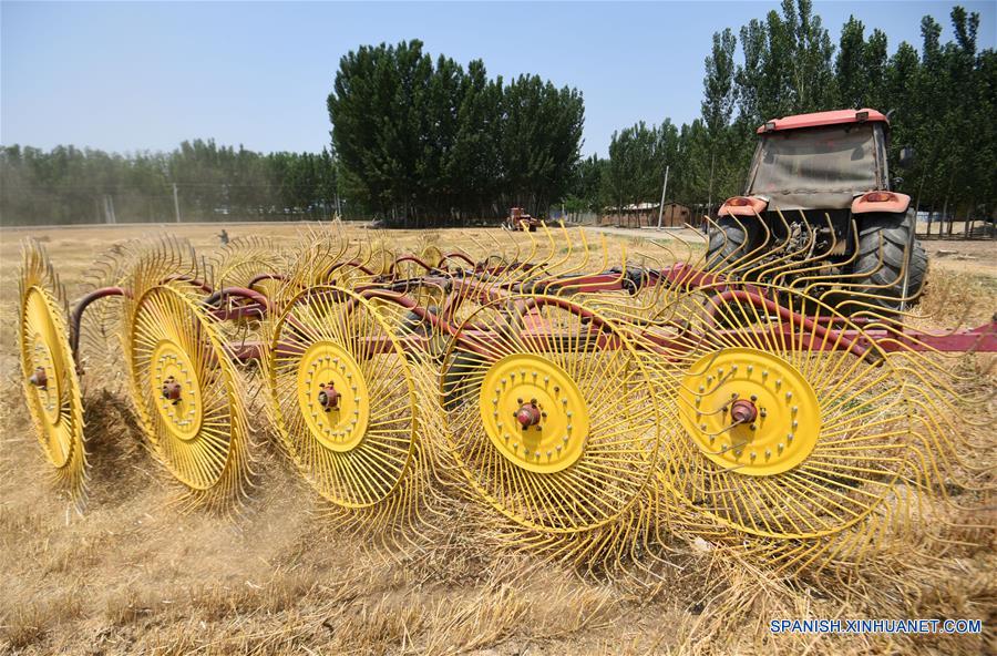 HEBEI, 18 junio, 2019 (Xinhua) -- Imagen del 17 de junio de 2019 de agricultores recolectando paja de trigo con maquinaria agrícola en el campo, en la villa de Lijiakou del distrito de Yongqing, provincia de Hebei, en el norte de China. Los agricultores están ocupados con el reciclaje de la paja de trigo cuando la temporada de cosecha ha llegado. La paja reciclada puede ser transformada en artesanías. (Xinhua/Lu Feng)