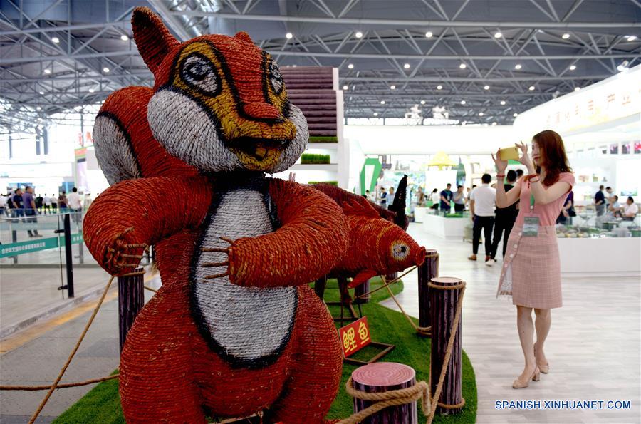 ANHUI, 18 junio, 2019 (Xinhua) -- Imagen del 17 de junio de 2019 de una visitante tomando fotografías de dibujos animados de animales hechos con paja de trigo en una exposición, en Hefei, capital de la provincia de Anhui, en el este de China. Los agricultores están ocupados con el reciclaje de la paja de trigo cuando la temporada de cosecha ha llegado. La paja reciclada puede ser transformada en artesanías. (Xinhua/Chen Bin)