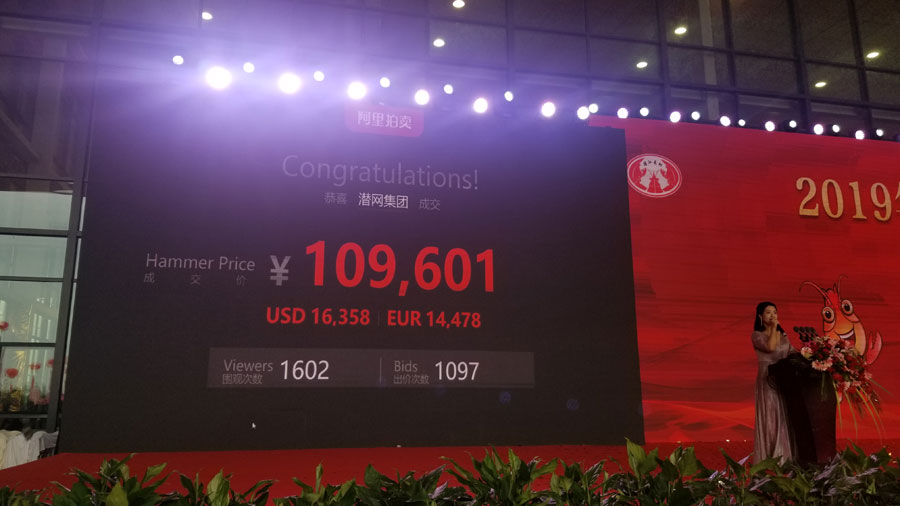 Durante la subasta, el cangrejo “rey” - de 165,7 gramos - fue rematado en 109.601 renminbi (15.823.4 dólares estadounidenses). [Fotografía: proporcionada a chinadaily.com.cn]