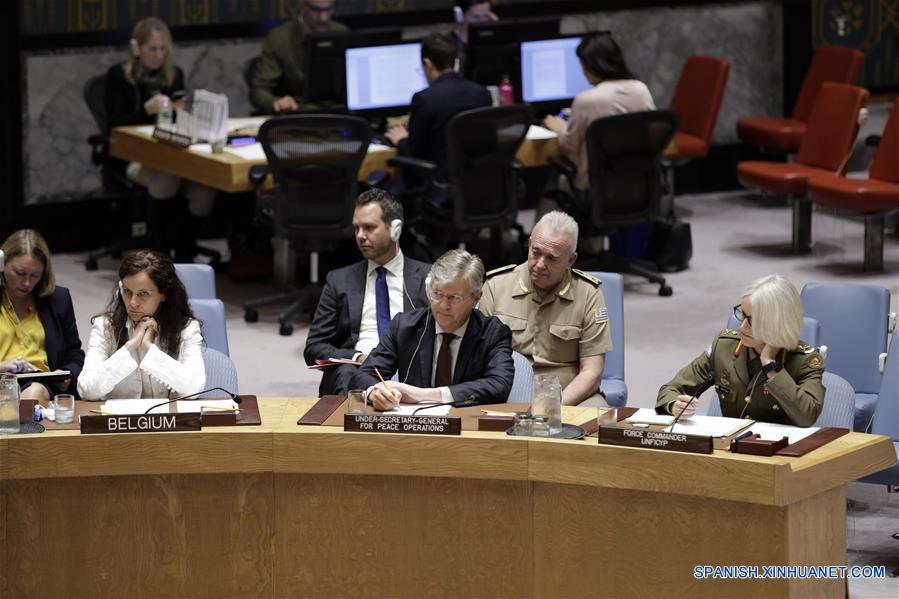 Jean-Pierre Lacroix (c-frente), subsecretario general de la Organización de las Naciones Unidas (ONU) para Operaciones de Mantenimiento de Paz, pronuncia un discurso durante una reunión del Consejo de Seguridad sobre las operaciones de mantenimiento de paz, en la sede de la ONU, en Nueva York, Estados Unidos, el 18 de junio de 2019. Las operaciones de mantenimiento de paz de la ONU deben apegarse a los propósitos y principios de la Carta de la ONU y a los principios fundamentales de las operaciones de mantenimiento de paz, dijo el martes Wu Haitao, representante permanente asistente de China ante la ONU. (Xinhua/Li Muzi)