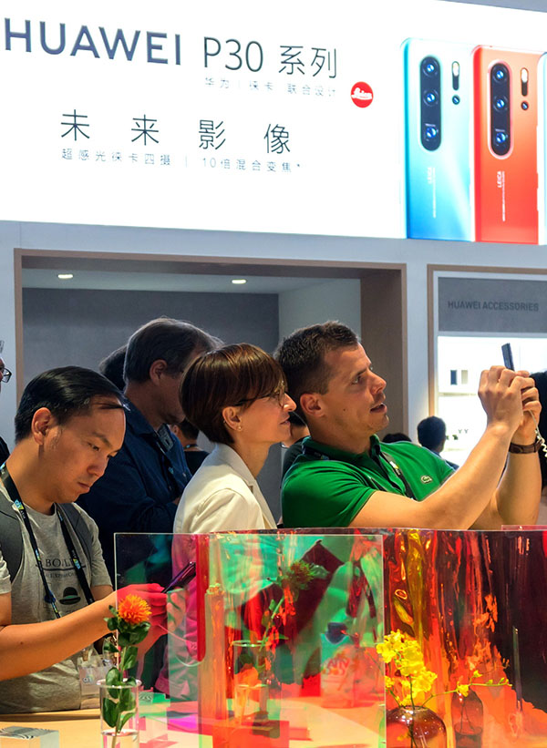 Teléfonos inteligentes Huawei P30 se exhiben durante CES Asia, una feria dedica a los productos electrónicos, Shanghai, 11 de junio del 2019. [Foto: Wang Gang/ China Daily]