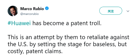 "Huawei se ha convertido en un troll de patentes", Rubio tuiteó la semana pasada en respuesta a un informe del Wall Street Journal que decía que Huawei quiere que Verizon pague las tarifas de licencia por sus patentes. "Este es un intento por parte de ellos de tomar represalias contra EE. UU al preparar el escenario para reclamaciones de patentes infundadas pero costosas".