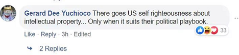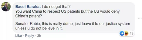 Otro usuario de Facebook escribió: “No lo entiendo eso. ?Desea que China respete las patentes de EE.UU pero que EE.UU deniegue las patentes de China? Esa medida es realmente tonta".