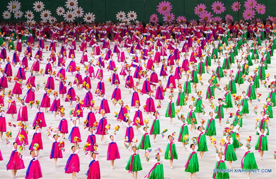 Un gran espectáculo de calistenia de masas y artístico se lleva a cabo en el Estadio Primero de Mayo en Pyongyang, República Popular Democrática de Corea (RPDC), el 20 de junio de 2019. Xi Jinping, secretario general del Comité Central del Partido Comunista de China (PCCh) y presidente chino, y su esposa, Peng Liyuan, acompa?ados por Kim Jong Un, presidente del Partido de los Trabajadores de Corea y presidente de la Comisión de Asuntos Estatales de la República Popular Democrática de Corea (RPDC), y su esposa, Ri Sol Ju, observaron el jueves el espectáculo. (Xinhua/Shen Hong)