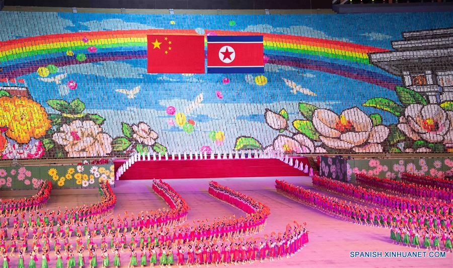 Un gran espectáculo de calistenia de masas y artístico se lleva a cabo en el Estadio Primero de Mayo en Pyongyang, República Popular Democrática de Corea (RPDC), el 20 de junio de 2019. Xi Jinping, secretario general del Comité Central del Partido Comunista de China (PCCh) y presidente chino, y su esposa, Peng Liyuan, acompa?ados por Kim Jong Un, presidente del Partido de los Trabajadores de Corea y presidente de la Comisión de Asuntos Estatales de la República Popular Democrática de Corea (RPDC), y su esposa, Ri Sol Ju, observaron el jueves el espectáculo. (Xinhua/Shen Hong)