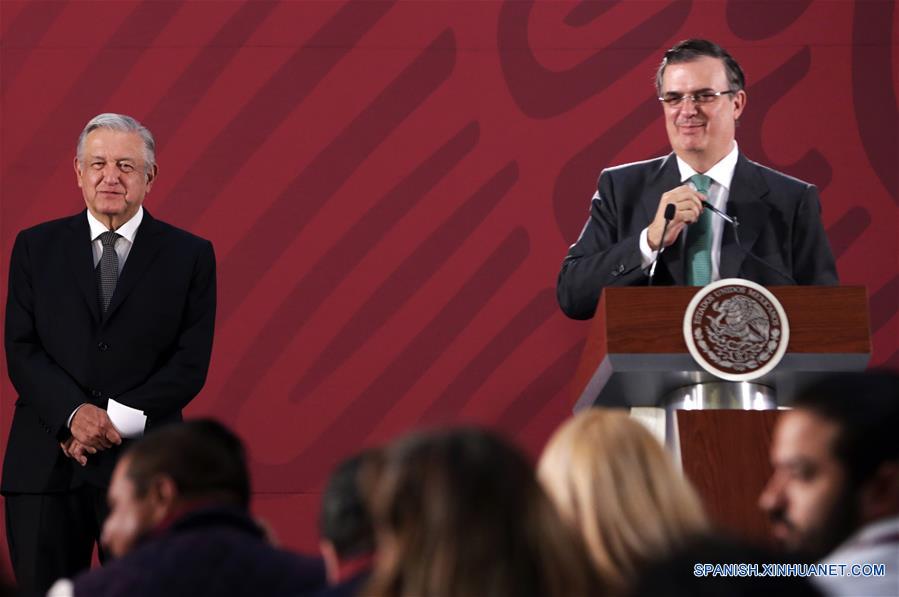 CIUDAD DE MEXICO, 21 junio, 2019 (Xinhua) -- El presidente de México, Andrés Manuel López Obrador (i), escucha mientras el secretario de Relaciones Exteriores, Marcelo Ebrard (d), pronuncia un discurso durante una conferencia de prensa en Palacio Nacional, en la Ciudad de México, capital de México, el 21 de junio de 2019. (Xinhua/Str)