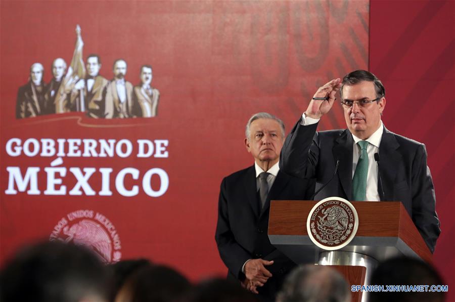 CIUDAD DE MEXICO, 21 junio, 2019 (Xinhua) -- El presidente de México, Andrés Manuel López Obrador (i), escucha mientras el secretario de Relaciones Exteriores, Marcelo Ebrard (d), pronuncia un discurso durante una conferencia de prensa en Palacio Nacional, en la Ciudad de México, capital de México, el 21 de junio de 2019. (Xinhua/Str)