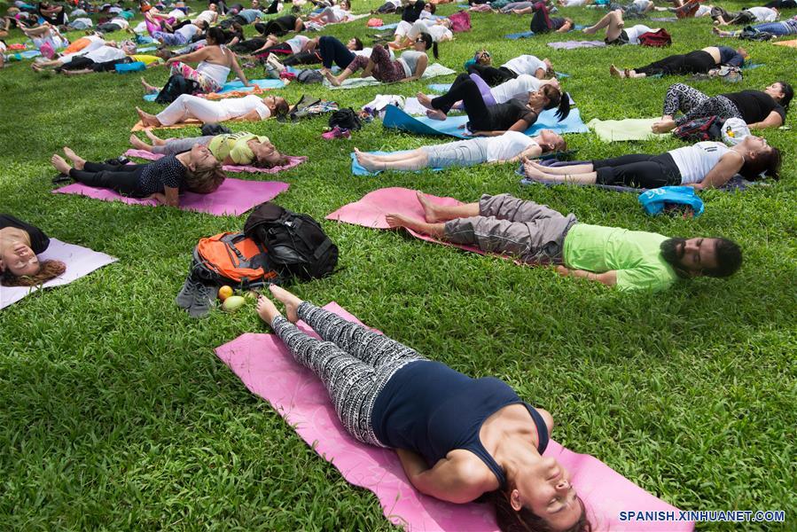 Personas practican yoga durante una clase abierta en el marco del Día Internacional del Yoga, en Caracas, Venezuela, el 22 de junio de 2019. La Asamblea General de la Organización de las Naciones Unidas (ONU) declaró el 21 de junio como Día Internacional del Yoga en 2014. (Xinhua/Marcos Salgado)