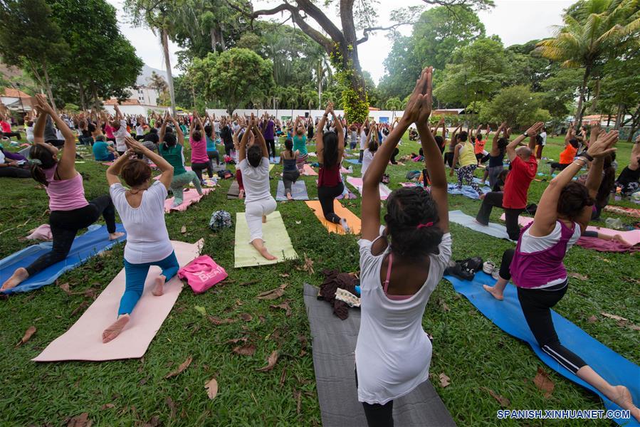 Personas practican yoga durante una clase abierta en el marco del Día Internacional del Yoga, en Caracas, Venezuela, el 22 de junio de 2019. La Asamblea General de la Organización de las Naciones Unidas (ONU) declaró el 21 de junio como Día Internacional del Yoga en 2014. (Xinhua/Marcos Salgado)