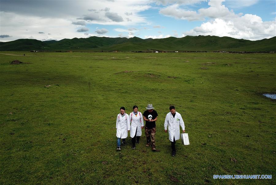Gansu, 25/06/2019 (El Pueblo en Línea) - Imagen del 23 de junio de 2019 de los miembros del equipo de ayuda médica, Chen Zhifang (2-i) y Chen Weiyu (2-d), caminando con pacientes en el condado de Maqu, en la Prefectura Autónoma tibetana de Gannan, en la provincia de Gansu, en el noroeste de China. El segundo Hospital Provincial del Pueblo de Gansu, ha mandado más de 30 doctores en cuatro grupos para proveer ayuda médica en el condado de Maqu, desde finales de 2015. Los doctores superaron las dificultades del mareo por altitud y la difícil transportación mientras trataban a los pacientes en el pastizal en la meseta. Al haber atendido a casi 10.000 personas hasta ahora, el equipo médico ha resuelto la dificultad de los pastores para ver a un doctor. (Xinhua/Ma Ning)