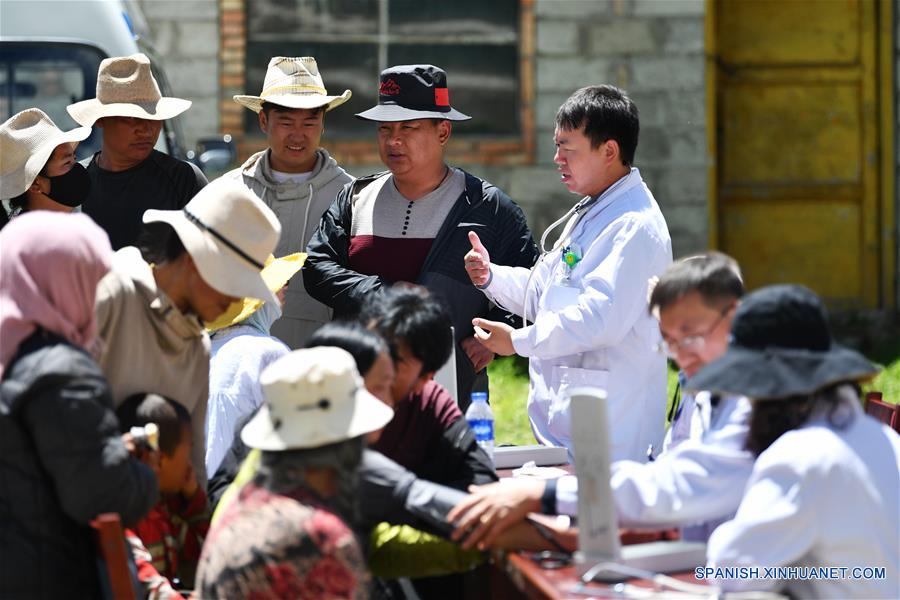 Gansu, 25/06/2019 (El Pueblo en Línea) - Imagen del 23 de junio de 2019 del líder del equipo de ayuda médica, Ma Taoye (3-d), explicando el cuidado de la salud a residentes en el condado de Maqu, en la Prefectura Autónoma tibetana de Gannan, en la provincia de Gansu, en el noroeste de China. El segundo Hospital Provincial del Pueblo de Gansu, ha mandado más de 30 doctores en cuatro grupos para proveer ayuda médica en el condado de Maqu, desde finales de 2015. Los doctores superaron las dificultades del mareo por altitud y la difícil transportación mientras trataban a los pacientes en el pastizal en la meseta. Al haber atendido a casi 10.000 personas hasta ahora, el equipo médico ha resuelto la dificultad de los pastores para ver a un doctor. (Xinhua/Chen Bin)