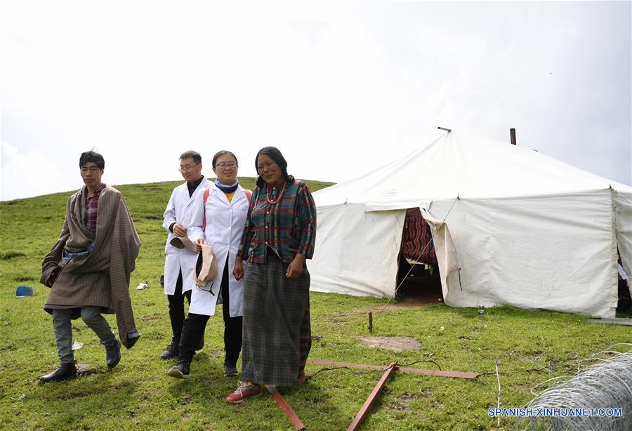 Gansu, 25/06/2019 (El Pueblo en Línea) - Imagen del 23 de junio de 2019 de los miembros del equipo de ayuda médica, Chen Zhifang (2-i) y Chen Weiyu (2-d), conversan con residentes en el condado de Maqu, en la Prefectura Autónoma tibetana de Gannan, en la provincia de Gansu, en el noroeste de China. El segundo Hospital Provincial del Pueblo de Gansu, ha mandado más de 30 doctores en cuatro grupos para proveer ayuda médica en el condado de Maqu, desde finales de 2015. Los doctores superaron las dificultades del mareo por altitud y la difícil transportación mientras trataban a los pacientes en el pastizal en la meseta. Al haber atendido a casi 10.000 personas hasta ahora, el equipo médico ha resuelto la dificultad de los pastores para ver a un doctor. (Xinhua/Chen Bin)