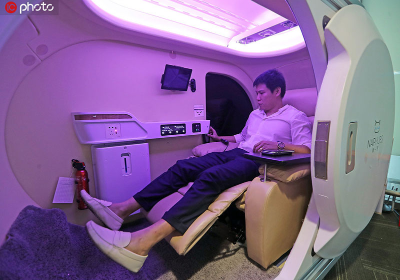 Un hombre experimenta una de las ocho cámaras de descanso instaladas en el Aeropuerto Internacional Xiaoshan de Hangzhou, provincia oriental china de Zhejiang, el 23 de junio de 2019. [Foto / IC]
