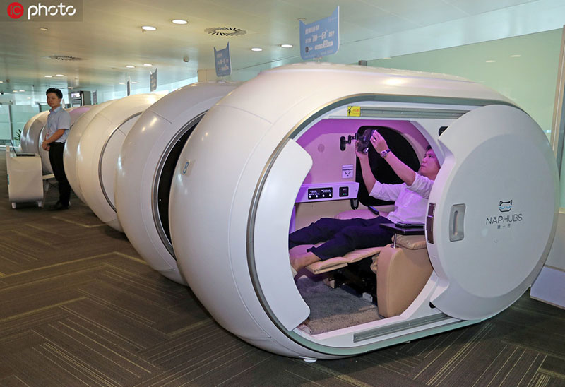Hangzhou, Zhejiang, 25/06/2019 (El Pueblo en Línea) - Un hombre experimenta una de las ocho cámaras de descanso instaladas en el Aeropuerto Internacional Xiaoshan de Hangzhou, provincia de Zhejiang, este de China, el 23 de junio de 2019. Los pasajeros pueden abrir la puerta escaneando el código QR. La cámara de descanso mide unos tres metros cuadrados. Hay un sillón reclinable, acceso a internet y tomas de corriente. [Foto / IC]