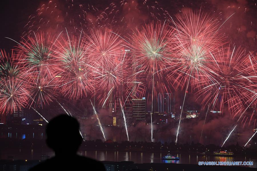 HUNAN, 26 junio, 2019 (Xinhua) -- Fuegos artificiales estallan para anunciar la próxima Exposición Económica y Comercial China-Africa, en Changsha, capital de la provincia de Hunan, en el centro de China, el 26 de junio de 2019. La próxima Exposición Económica y Comercial China-Africa se llevará a cabo del 27 al 29 de junio. (Xinhua/Xue Yuge)