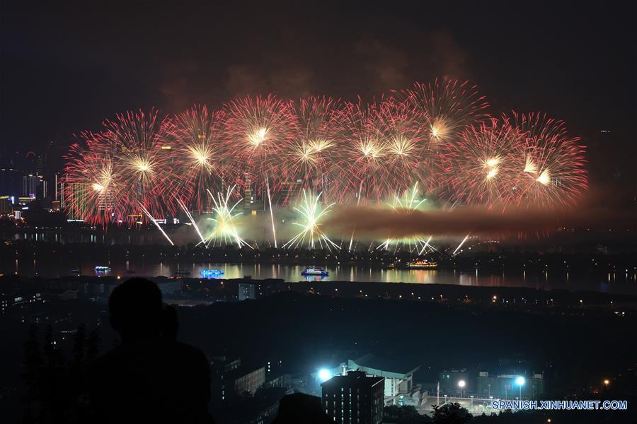 HUNAN, 26 junio, 2019 (Xinhua) -- Fuegos artificiales estallan para anunciar la próxima Exposición Económica y Comercial China-Africa, en Changsha, capital de la provincia de Hunan, en el centro de China, el 26 de junio de 2019. La próxima Exposición Económica y Comercial China-Africa se llevará a cabo del 27 al 29 de junio. (Xinhua/Xue Yuge)