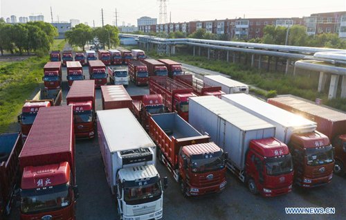 La foto aérea tomada el 12 de junio de 2019 muestra a los camiones Jiefang del Primer Taller de Automóviles (FAW, por sus siglas en inglés) en Changchun, provincia de Jilin, el 13 de junio del 2019. El Grupo FAW, principal fabricante de automóviles de China, ha asumido una serie de “reformas quirúrgicas” relacionadas con sus recursos humanos y la reconstrucción de la marca. (Foto: Xinhua)