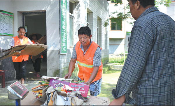 Trabajadores sanitarios pesan residuos antes de enviarlos a una empresa de reciclaje y recursos renovables en Wugang, provincia de Hunan. [Foto: Xinhua]