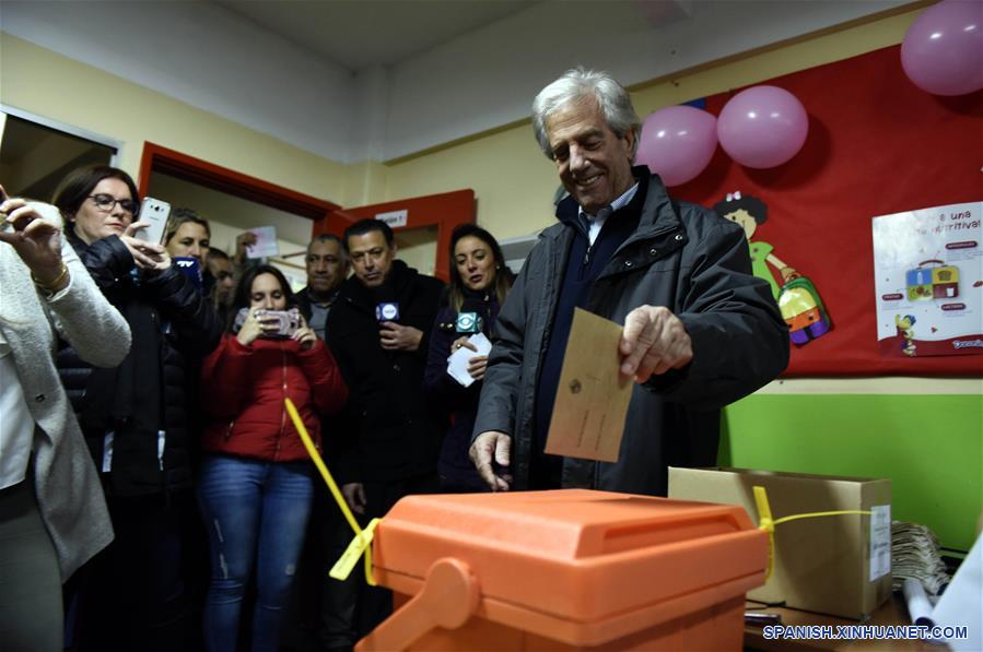 El presidente uruguayo, Tabaré Vázquez (c), emite su voto durante las elecciones primarias en Montevideo, capital de Uruguay, el 30 de junio de 2019. Las elecciones primarias en Uruguay, en las que los partidos políticos eligen a sus candidatos a la presidencia para los comicios generales del 27 de octubre, transcurren el domingo con normalidad y con llamados a la población a que asista a las urnas. (Xinhua/Nicolás Celaya)