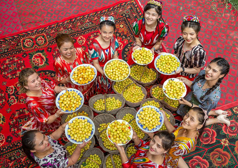 Mujeres cosechan almendras en Kuqa, Región Autónoma Xinjiang Uyghur, el 16 de junio del 2019. El condado ha desarrollado una cadena industrial en el sector de la almendra que se ha convertido en una importante fuente de ingresos para los agricultores locales. (Foto: Yuan Huanhuan/ Pueblo en Línea)