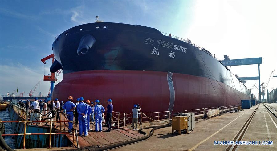 DALIAN, 1 julio, 2019 (Xinhua) -- Imagen del 25 de junio de 2019 de un barco de carga atracado en la empresa Dalian Shipbuilding Industry Co., Ltd., en Dalian, en el noreste de China. El Foro Davos de Verano 2019 se llevará a cabo del 1 al 3 de julio en la ciudad costera de Dalian, en el noreste de China. Creado por el Foro Económico Mundial (FEM) en 2007, el Davos de Verano se celebra cada a?o en China. Alterna la sede entre las ciudades costeras de Dalian y Tianjin. El Foro Davos de Verano, ayudó a Dalian a reformar el paisaje de la economía regional y fortalecer el comercio del puerto con otros mercados. Dalian se ha convertido en una ciudad internacional y una muestra de la reforma y apertura de China. (Xinhua/Yao Jianfeng)