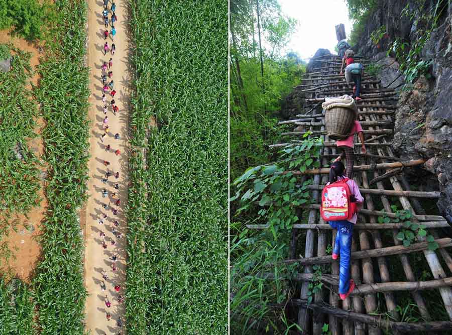 El 10 de mayo de 2019, los estudiantes caminan por una carretera nueva para ir la escuela en un pueblo de la región autónoma Zhuang de Guangxi. Derecha: los estudiantes suben unas escaleras de madera para ir la escuela en el mismo pueblo, el 4 de julio de 2012. [Foto / Xinhua]
