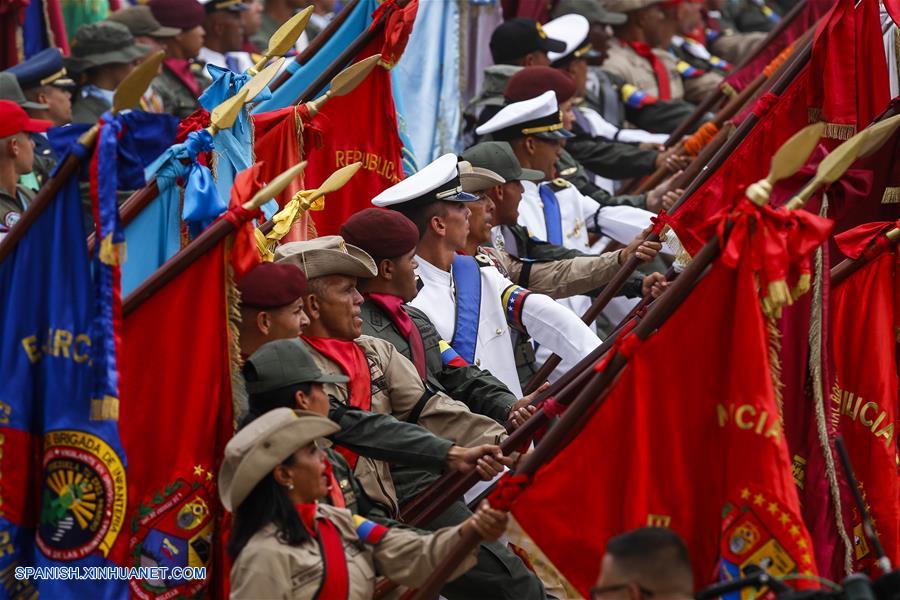 Elementos del ejército asisten a un desfile para conmemorar el 208 aniversario de la Independencia de Venezuela, en Caracas, Venezuela, el 5 de julio de 2019. El presidente venezolano, Nicolás Maduro, anunció el viernes en un discurso con motivo del desfile cívico-militar de celebración de los 208 a?os de la Independencia venezolana, que la Fuerza Armada Nacional Bolivariana (FANB) realizará ejercicios militares el 24 de julio en homenaje al Libertador Simón Bolívar, nacido el 24 de julio de 1783, y a la Armada, creada en 1811. (Xinhua/Str)