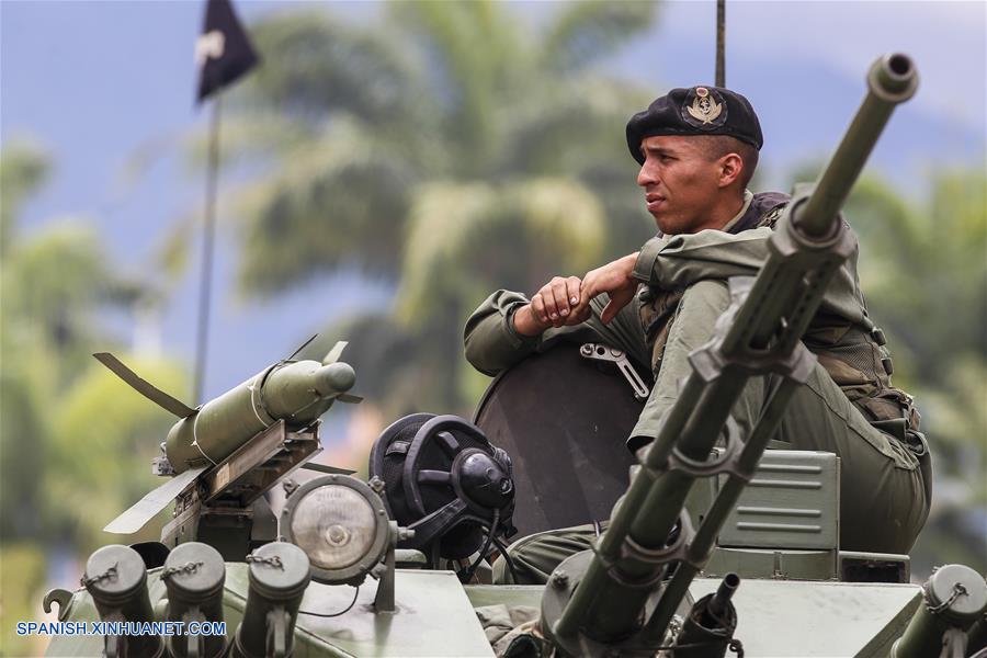 Un elemento del ejército asiste a un desfile para conmemorar el 208 aniversario de la Independencia de Venezuela, en Caracas, Venezuela, el 5 de julio de 2019. El presidente venezolano, Nicolás Maduro, anunció el viernes en un discurso con motivo del desfile cívico-militar de celebración de los 208 a?os de la Independencia venezolana, que la Fuerza Armada Nacional Bolivariana (FANB) realizará ejercicios militares el 24 de julio en homenaje al Libertador Simón Bolívar, nacido el 24 de julio de 1783, y a la Armada, creada en 1811. (Xinhua/Str)
