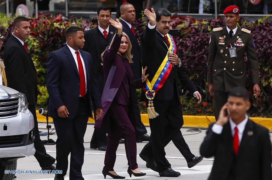 El presidente de Venezuela, Nicolás Maduro (2-d), saluda a su llegada a un desfile para conmemorar el 208 aniversario de la Independencia de Venezuela, en Caracas, Venezuela, el 5 de julio de 2019. El presidente venezolano, Nicolás Maduro, anunció el viernes en un discurso con motivo del desfile cívico-militar de celebración de los 208 a?os de la Independencia venezolana, que la Fuerza Armada Nacional Bolivariana (FANB) realizará ejercicios militares el 24 de julio en homenaje al Libertador Simón Bolívar, nacido el 24 de julio de 1783, y a la Armada, creada en 1811. (Xinhua/Str)